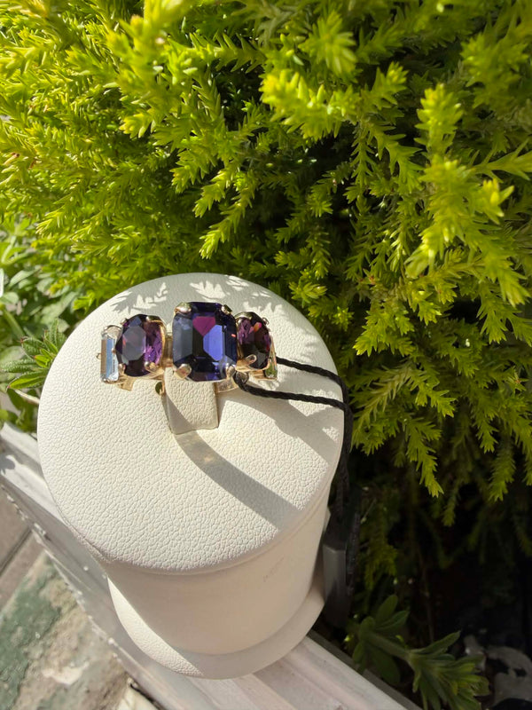 Un anello dal design regale e contemporaneo che cattura l'essenza dell'eleganza notturna. Questo modello presenta una splendida composizione a tre pietre centrali (trilogy) con cristalli taglio cushion in varie sfumature di viola intenso • La montatura dorata regolabile avvolge le gemme con castoni robusti ma raffinati, culminando con piccoli punti luce laterali che ne esaltano la brillantezza. • Perfetto da indossare da solo come pezzo forte o in abbinamento agli orecchini della stessa linea per un look coordinato e sofisticato.