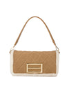 Al centro spicca una chiusura rettangolare in metallo dorato lucido,manico a spalla e tracolla.