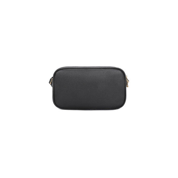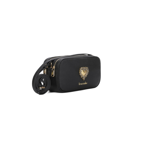 Borsa a tracolla in pelle di colore nero dalla linea compatta e minimalista. Il cuore dorato con dettagli decorativi sul fronte dona un tocco romantico e prezioso. Con una tracolla regolabile con catena che aggiunge un tocco raffinato. Dotata di doppia zip con l’interno provvisto di tasche, è perfetto per custodire con ordine gli oggetti essenziali. Un modello sobrio e versatile, da indossare ogni giorno con naturale eleganza.