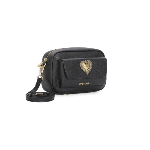 Borsa a tracolla in pelle di colore nero pensata per chi ama la praticità senza rinunciare allo stile. Il design compatto è impreziosito da una tasca frontale con pattina decordata da un cuore dorato sul fronte e logo Braccialini in metallico dorato. Una tracolla regolabile e removibile, l’interno foderato custodisce piccoli oggetti quotidiani con discrezione. Comoda da portare, raffinata da indossare, è l’alleata perfetta per ogni giorno.