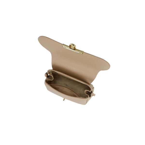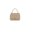 Borsa a mano di medie dimensioni in morbida pelle di colore taupe, dal design elegante e minimale. La struttura rigida con patta frontale è impreziosita da una chiusura girello dorata con logo inciso. Dotata di manico superiore e tracolla regolabile e removibile, offre una doppia portabilità, a mano o a spalla. Un accessorio raffinato e versatile, ideale per accompagnare ogni look con discreta eleganza.