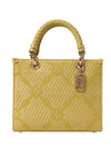Borsa tote piccola, realizzata in tessuto jacquard con pattern a losanga. Ha manico tubolare intrecciato, impreziosito dagli charms in metallo dorato con logo.