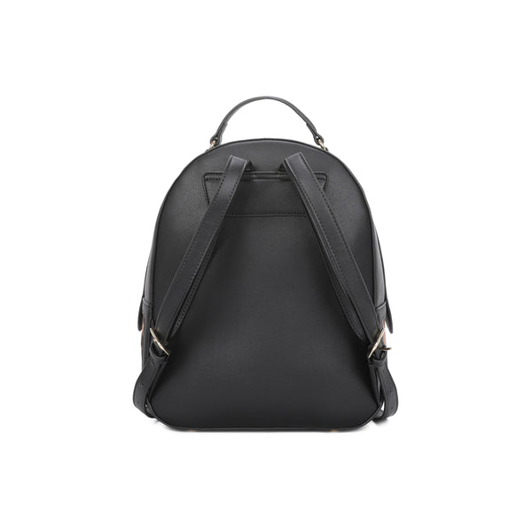 Zaino compatto in similpelle nera con manico singolo e spallacci regolabili. La pattina frontale, impreziosita da borchie dorate, applicazioni metalliche e ricami floreali, si abbina al pannello centrale effetto animalier per un look deciso e grintoso. Comodo e pratico, è perfetto per completare con personalità gli outfit urbani di ogni giorno