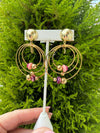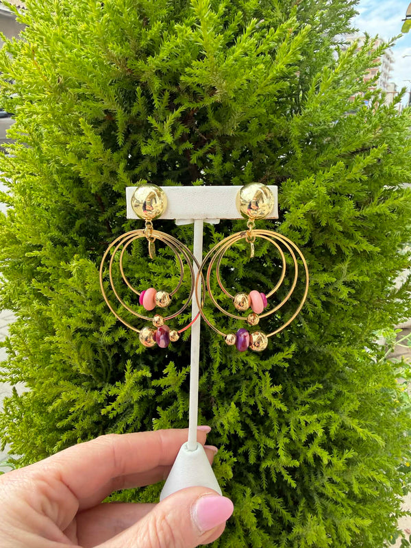 Un paio di orecchini che donano un aura dinamica e sontuosa. Design moderno che evoca satelliti immaginari, con una splendente cupolina che sorregge un grande cerchio associato a cerchi minori sui quali orbitano radiose boule ed altri luminosi elementi. per un unicum esclusivo e trendy. Una coppia di accessori perfetti per qualsiasi occasione, nelle loro cromie del rosa, fucsia, viola e oro, con logo Sodini sul pendente. Materiali: ottone, poliestere riciclato. Lunghezza 6 cm. Chiusura a farfalla.