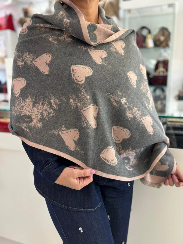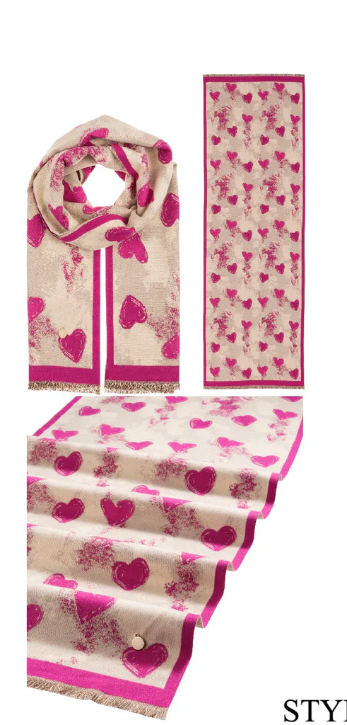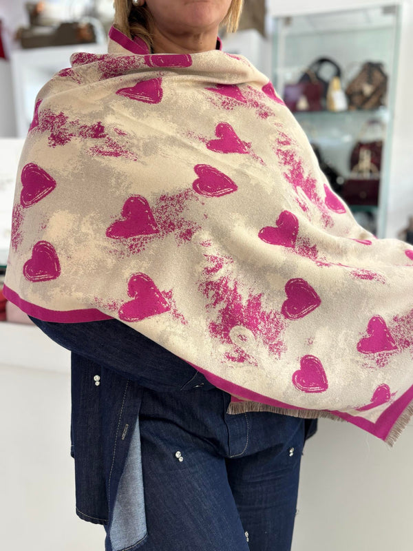 Sciarpa con fantasia a cuori, con piccole frange all'estremità. Bella, colorata e dallo stile inconfondibile.