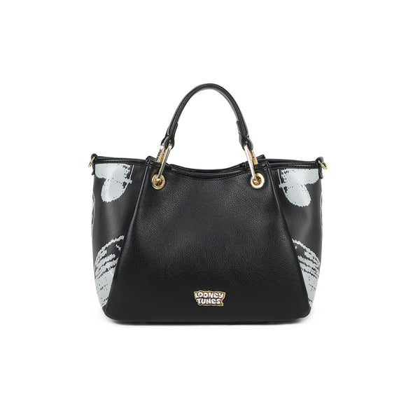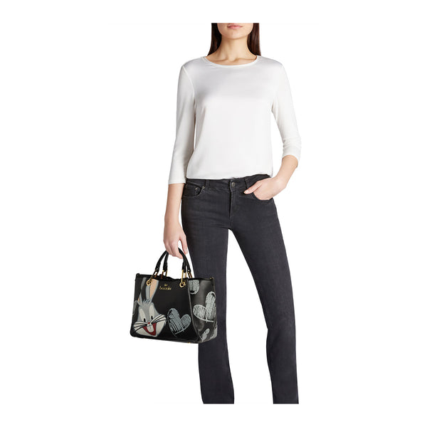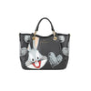 Borsa a mano di medie dimensioni con doppi manici, nasconde tra le cuciture dei pannelli laterali un dettaglio che ne consente l’ampliamento. Realizzata in similpelle nera, si distingue per i dettagli dorati sui manici e per l’interno rosa a contrasto. Sul fronte, l’iconico Bugs Bunny prende vita con una stampa vivace e dettagli in rilievo, affiancato da maxi cuori effetto pennarello. Una tracolla logata removibile e regolabile completa l'accessorio, pensato per chi ama unire praticità e ironia in un look giocoso e contemporaneo.