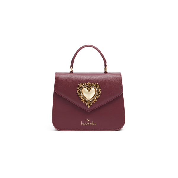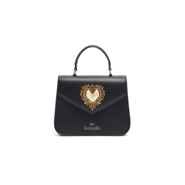 Borsa a mano in similpelle, elegante e raffinata, arricchita da un prezioso cuore gioiello dorato in stile barocco che aggiunge un tocco scenografico a un modello senza tempo. Dotata di manico singolo e tracolla regolabile e removibile per una doppia portabilità, è il perfetto equilibrio tra romanticismo e carattere.
