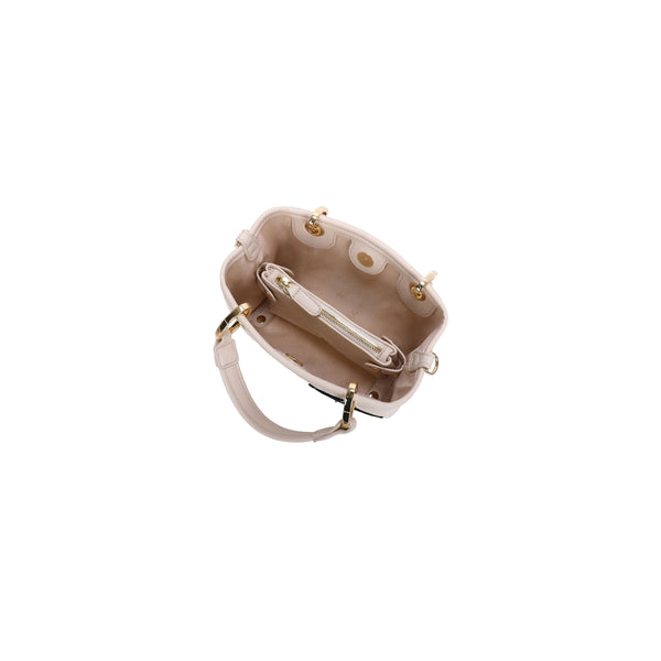 Borsa a mano di piccole dimensioni in colore beige, con doppi manici e tracolla logata removibile e regolabile per una doppia portabilità. Il protagonista assoluto è Daffy Duck, in un'applicazione frontale ricamata che dona alla borsa un tocco ironico e distintivo, perfetta per chi ama farsi notare con stile e leggerezza.