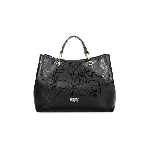 Borsa a mano di medie dimensioni in colore nero, con doppi manici e tracolla logata removibile e regolabile per una doppia portabilità. Il protagonista assoluto è Silvestro, in un'applicazione frontale ricamata che dona alla borsa un tocco ironico e distintivo, perfetta per chi ama farsi notare con stile e leggerezza.