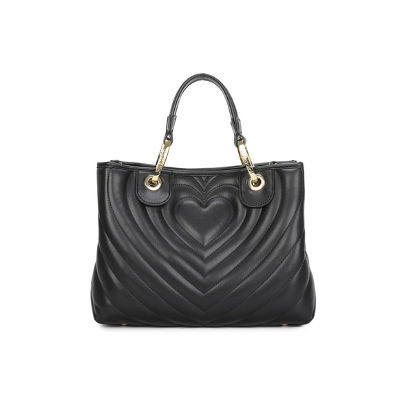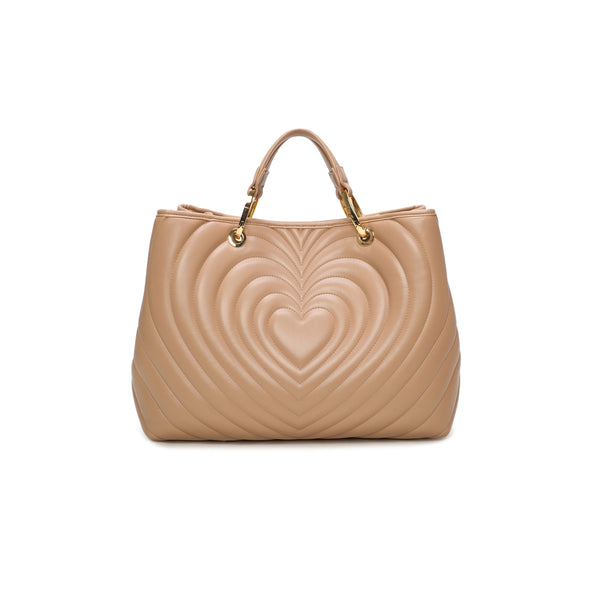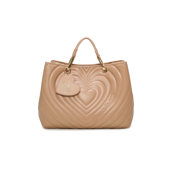 Borsa a mano di grandi dimensioni in colore taupe, con doppi manici e tracolla removibile e regolabile per una doppia portabilità. Presenta una lavorazione trapuntata a forma di cuore che dona volume e carattere al design. Il charm a forma di cuoricino applicato al manico nasconde un pratico specchietto, perfetto per ogni momento. All’interno, una pochette estraibile utilizzabile come seconda borsa.