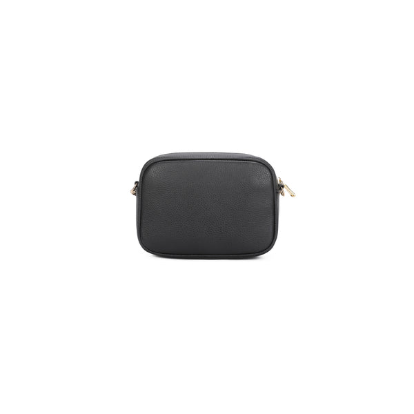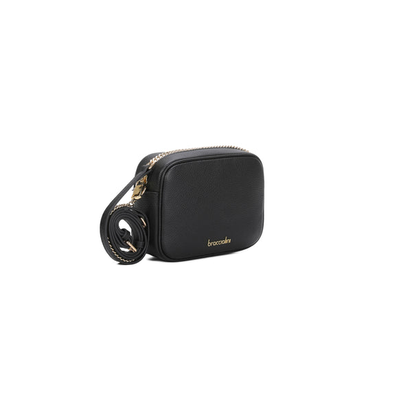 Borsa a tracolla in pelle di colore nero dalla linea compatta e minimalista. Con una tracolla regolabile con catena che aggiunge un tocco raffinato. Dotata di zip con l’interno provvisto di tasche, è perfetto per custodire con ordine gli oggetti essenziali. Un modello sobrio e versatile, da indossare ogni giorno con naturale eleganza.