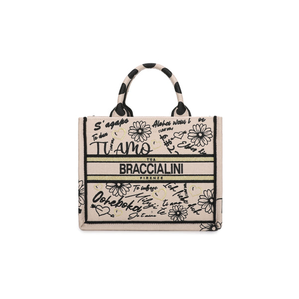 Borsa a mano dalle medio piccole dimensioni con doppio manico, realizzata in tessuto con ricami esclusivi che celebrano il linguaggio universale dell’amore: scritte romantiche e fiori stilizzati si intrecciano in un gioco grafico originale e logo ricamato. Dotata di una pratica pochette estraibile e una tracolla removibile che ne permette la doppia portabilità.
