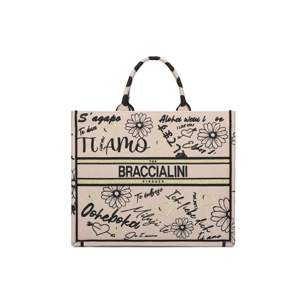 Borsa a mano dalle grandi dimensioni con doppio manico, realizzata in tessuto con ricami esclusivi che celebrano il linguaggio universale dell’amore: scritte romantiche e fiori stilizzati si intrecciano in un gioco grafico originale e logo ricamato. Dotata di una pratica pochette estraibile e una tracolla removibile che ne permette la doppia portabilità.
