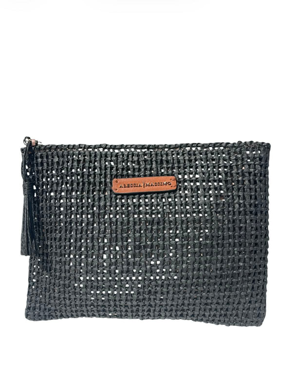 Pochette Alessia & Massimo in rafia a rete larga con interno in tessuto beige. Pratica e versatile, perfetta per custodire oggetti di piccole dimensioni. Ciondolo decorativo in rafia e targhetta frontale in ecopelle con scritta "Alessia Massimo" completano il design elegante e raffinato.
