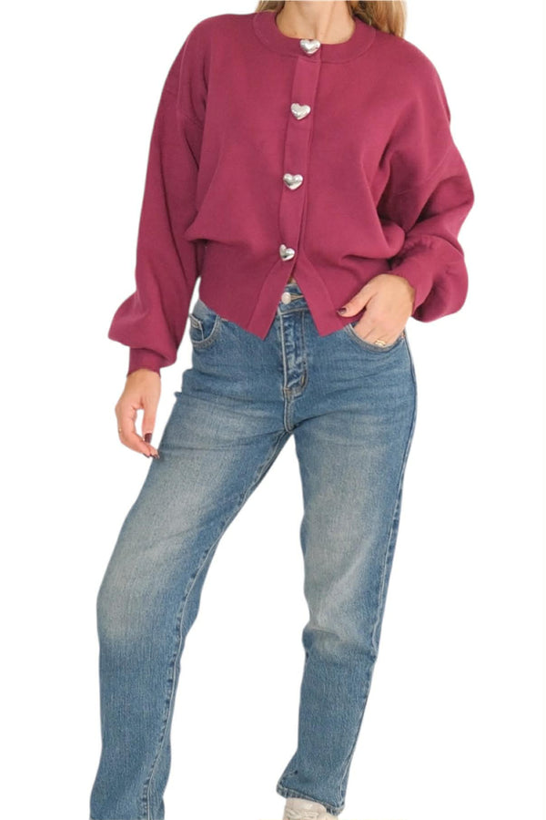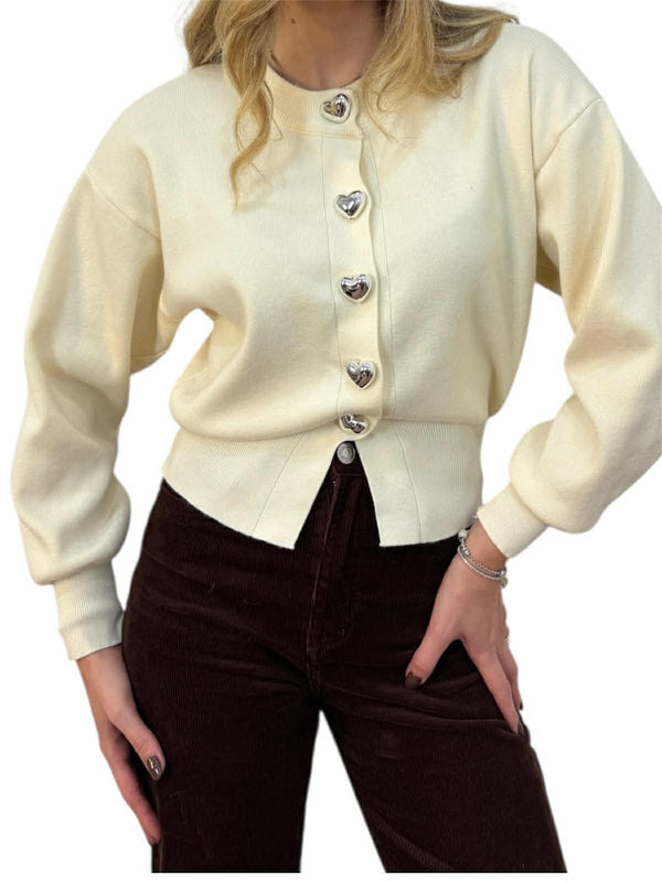 Cardigan con bottoni cuori panciuti in metallo silver.
