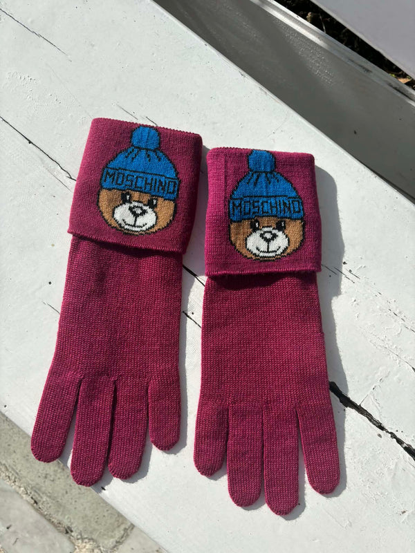 Guanti Moschino in lana caldi e morbidi colore magenta con stampa orsetto teddy.