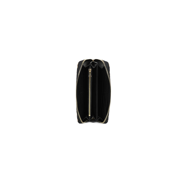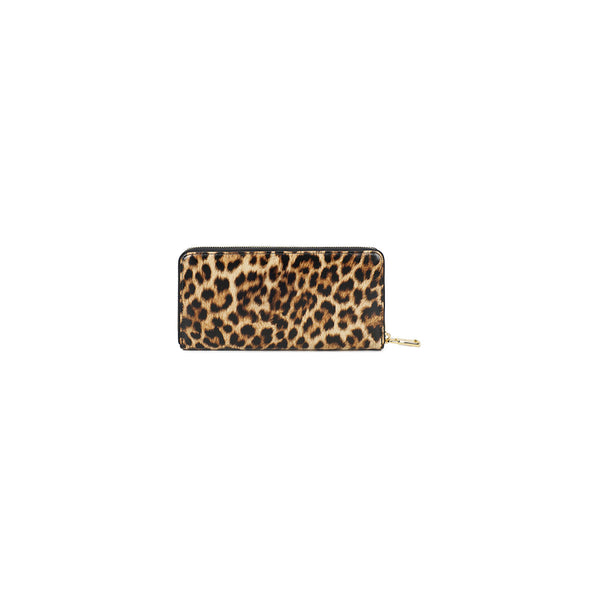 Portafoglio modello zip around in pelle con stampa leopardata e logatura dorata frontale. Una tasca interna con zip per la moneta.