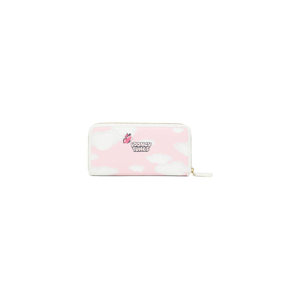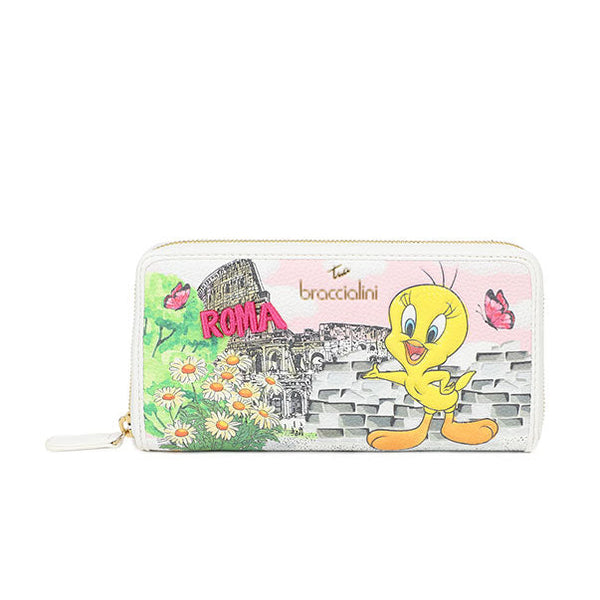 Portafoglio modello zip around decorato da una stampa ispirata alla città di Roma, vede protagonista Titti tra margherite, farfalle e l’iconico Colosseo