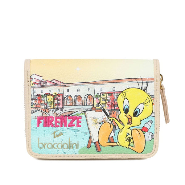 Portafogli piccolo decorato con una vivace stampa ispirata a Firenze, dove l’iconico Titti si diverte tra pennelli, colori e dettagli artistici