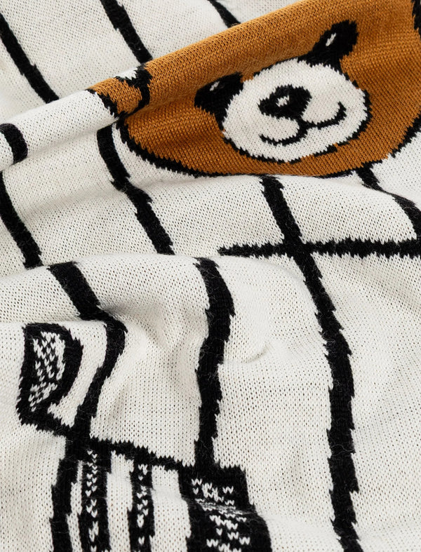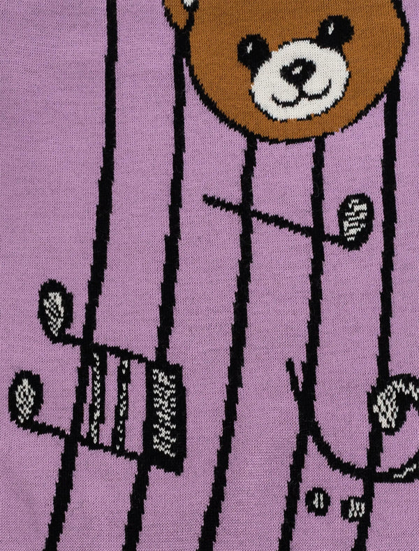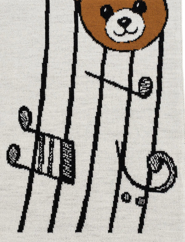 Sciarpa in lana rasata con grafica orsetto teddy e note musicali.