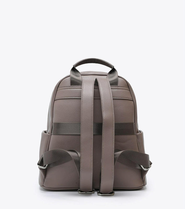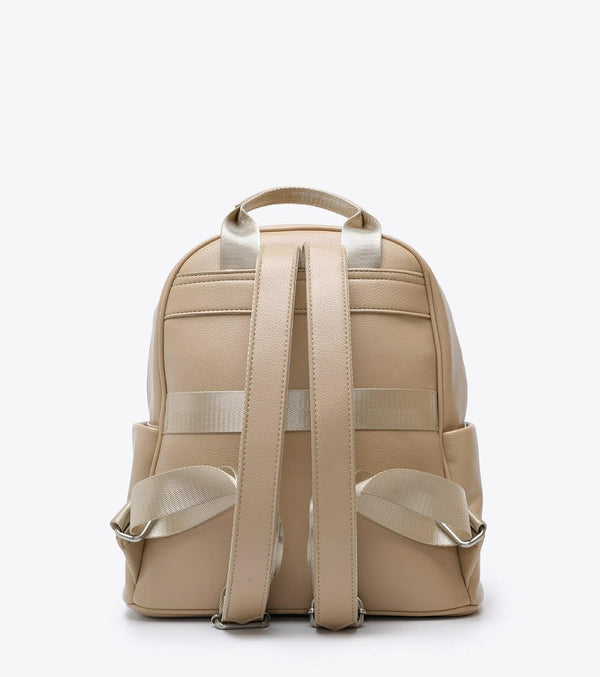 Zaino da donna Katrin in similpelle. È progettato in grandi dimensioni per offrire grande capienza e organizzazione. L'interno è foderato e presenta una custodia con cerniera e due tasche aperte per piccoli oggetti. L'esterno presenta tasche laterali, spallacci posteriori regolabili e una cinghia aggiuntiva per agganciarlo a una valigia. Si chiude con una doppia cerniera metallica in tonalità argento opaco. Comodo e pratico per tutti i giorni.